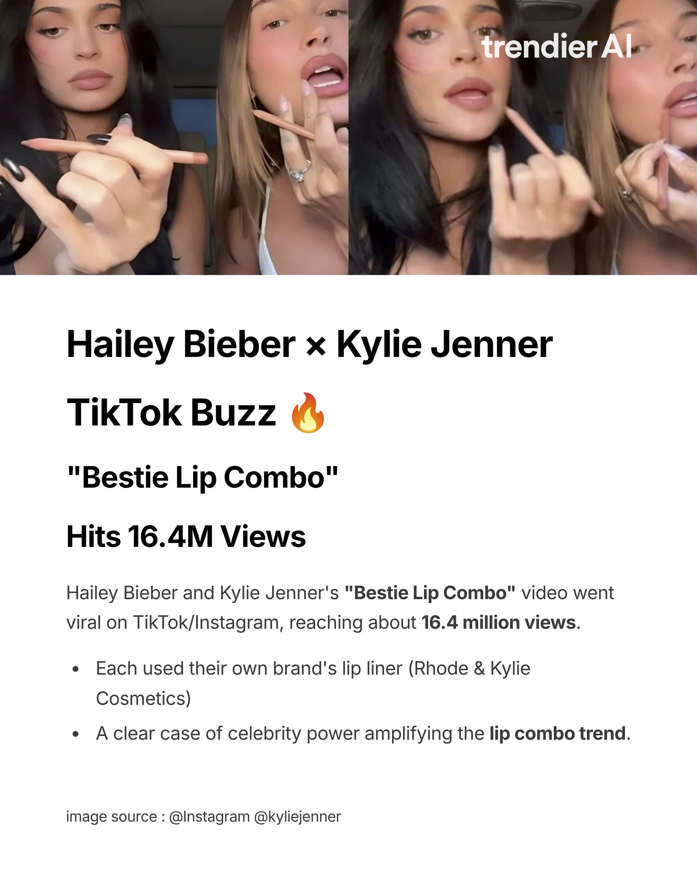최근 틱톡에서 헤일리 비버와 카일리 제너의 "Bestie Lip Combo" 영상이 1,640만 뷰를 돌파하며, 미국 전역에서 #LipLiner 카테고리의 검색과 리뷰가 폭발적으로 증가했습니다.