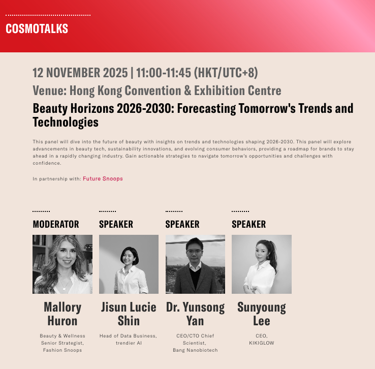 본 세션은 K-BEAUTY TREND SUMMIT 2025 공식 프로그램 중 트렌디어 AI 구독자 전용 콘텐츠로 공개될 예정입니다. 사전 등록을 완료하시면 전체 프로그램과 시청 안내를 받아보실 수 있습니다. |